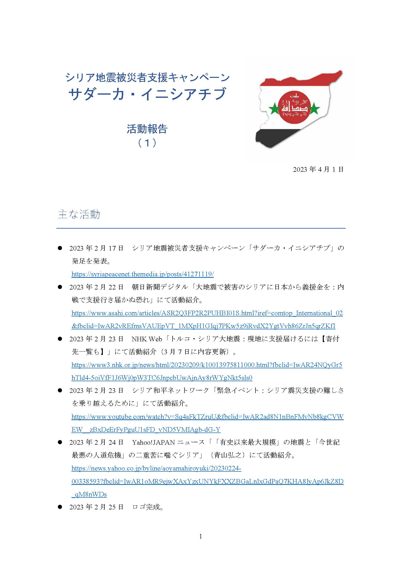 シリア地震被災者支援キャンペーン「サダーカ・イニシアチブ」を立ち上げてから1ヵ月半余りが経ちました。