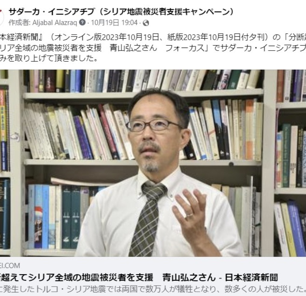 シリア地震被災者支援キャンペーン「サダーカ・イニシアチブ」と発起人・代表を務める東京外国語大学の青山弘之教授の取り組みが『日本経済新聞』(オンライン版2023年10月19日、紙版2023年10月19日付夕刊) で紹介されました。
