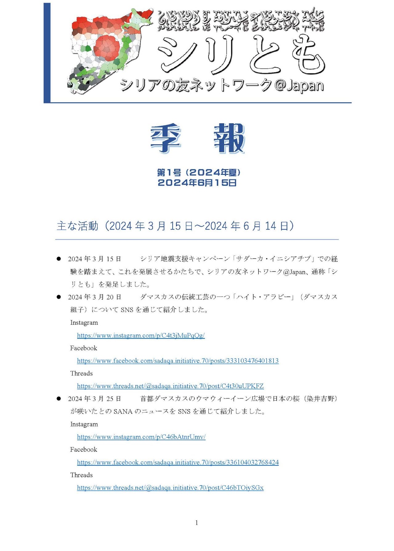 シリともの発足から3ヵ月が経ちました。第1回目の活動報告となるシリア季報第1号(2024年春)を以下URLにて公開しました。是非ご覧ください。