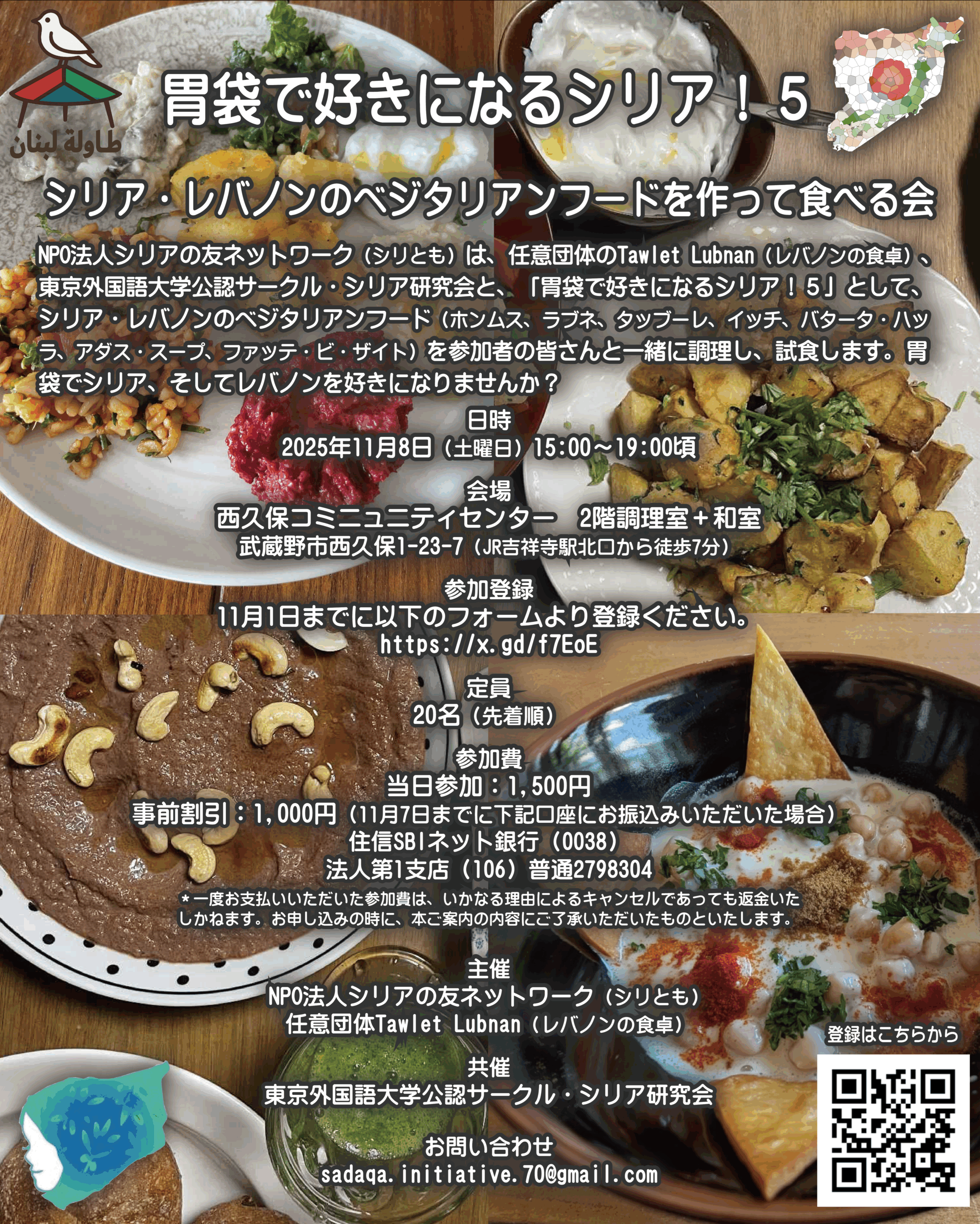 NPO法人シリアの友ネットワーク(シリとも)は、任意団体のTawlet Lubnan(Lebanon Table、レバノンの食卓)、東京外国語大学公認サークル・シリア研究会と、「胃袋で好きになるシリア!5」として、シリア・レバノンのベジタリアンフード(ホンムス、ラブネ、タッブーレ、イッチ、バタータ・ハッラ、アダス・スープ、ファッテ・ビ・ザイトを参加者の皆さんと一緒に調理し、試食します。胃袋でシリア、そしてレバノンを好きになりませんか?